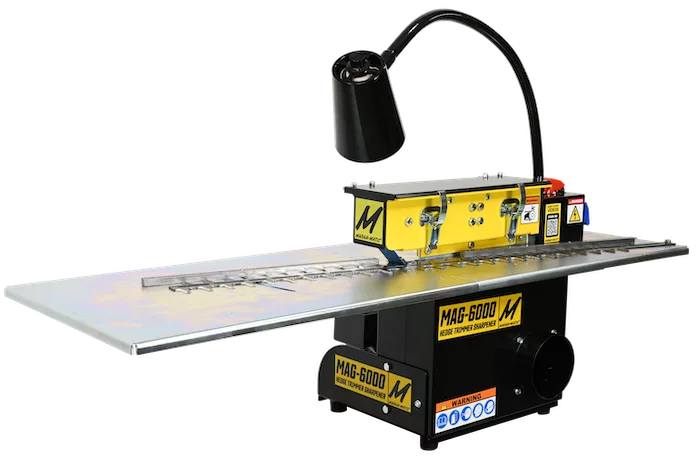 The MAG-6000 accurately and safely allows sharpening of hedge trimmer blades by keeping a consistent cutting-edge angle.
